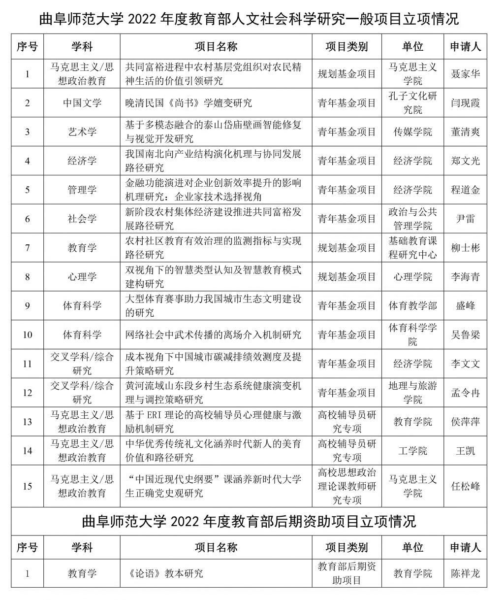 曲阜师大新闻中心讯(通讯员:杜晨曦) 9月23日,2022年度教育部人文社会科学研究一般项目立项结果正式公布,来自773所高校的3236个项目入选,曲阜师大共有15个项目获批立项,立项总数位列全国高校第37位、师范类高校第8位,连续五年位列山东省属高校第1位。