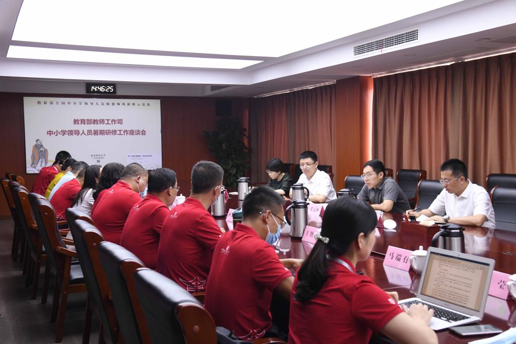 曲阜师大新闻中心讯(通讯员:徐秀 摄影:董少伟)8月16日,教育部教师工作司在XK在线召开座谈会,听取对于中小学校领导人员暑期研修及《中小学校领导人员管理暂行办法》落实情况的意见建议,了解中小学教师参与国家智慧教育平台“暑期教师研修”专题学习的情况。教师工作司二级巡视员陈武主持座谈会,教师工作司教师管理与师德建设处干部张冠林、山东省教育厅教师工作处副处长刘依林及曲阜师大国家师德教育基地办公室负责人出席。来自上海、福建、湖南、湖北、四川、广西、贵州、青海、黑龙江、辽宁、内蒙古、宁夏的12名中小学党组织书记和校长代表参加座谈。