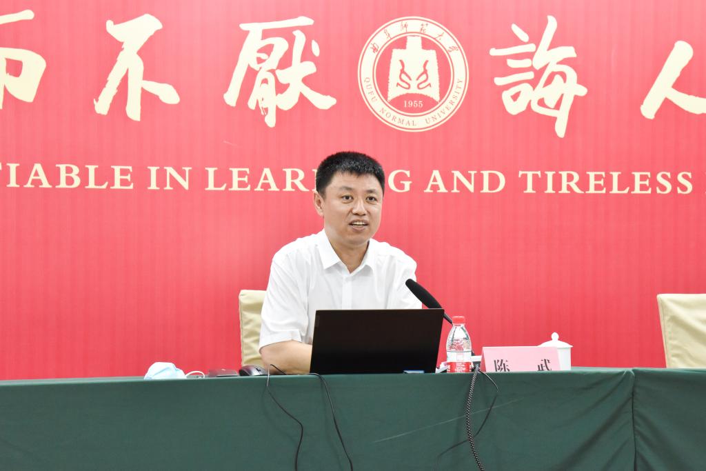 曲阜师大新闻中心讯(记者:刘萌 摄影:刘萌 董少伟)8月16日上午,教育部教师工作司二级巡视员陈武为全国中小学领导人员师德师风研修示范班全体学员作主旨报告,山东省教育厅副厅长孙晓筠,教师工作司教师管理与师德建设处干部张冠林、山东省教育厅教师工作处副处长刘依林聆听了讲座。报告由曲阜师大党委常委、副校长李兆祥主持。