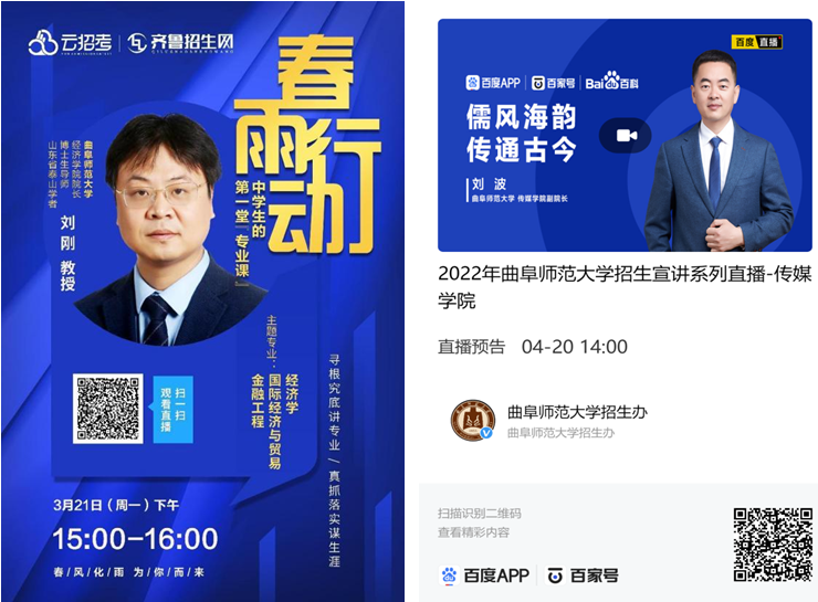 精心谋划,做到线上线下双轮驱动。招生办公室总结往年好做法,紧跟今年新形势,进一步完善招生工作方案,采用线上直播和线下咨询会双轮驱动的方式开展招生宣传与咨询,做到了早启动、多渠道、广覆盖。高考前,招生办与齐鲁招生网、百度等平台合作开展“云宣讲”,组织学校高层次专家学者通过在线直播的形式走进中学,介绍学校的人才培养、就业质量等情况,吸引广大高考学子关注曲阜师大。学校目前已与中国教育在线、齐鲁招生网等平台合作进行线上招生咨询宣讲十余场,并与齐鲁晚报等媒体合作,在山东省十六地市参加线下高考招生咨询会七十余场。