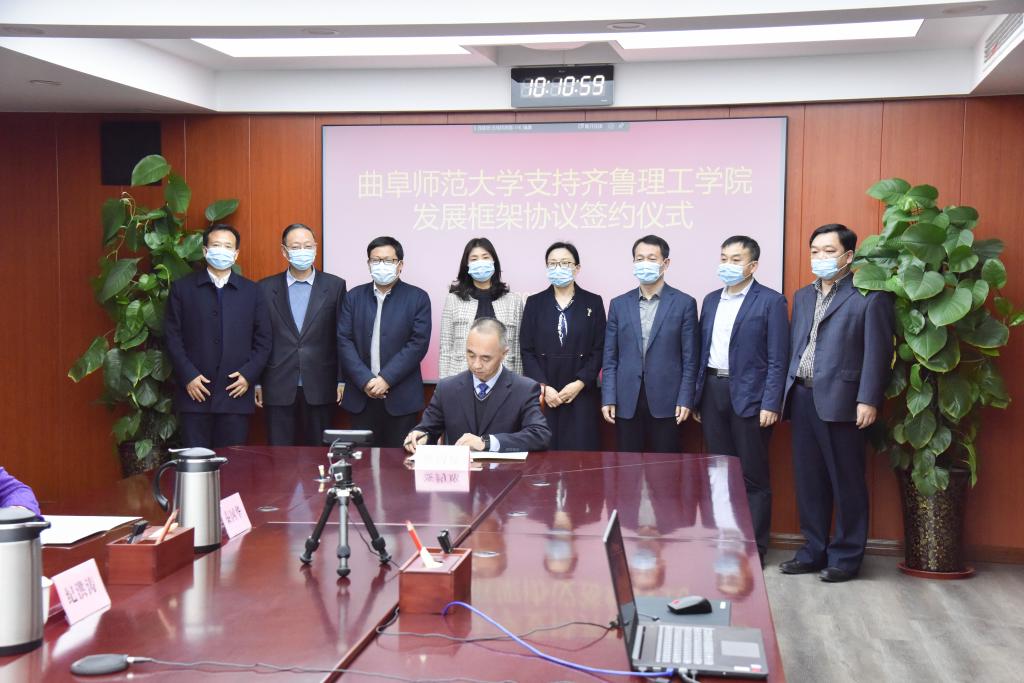 曲阜师大新闻中心讯(记者:刘萌 张亚茹 臧晓慧)3月10日上午,曲阜师大与齐鲁理工学院通过视频会议举行支持齐鲁理工学院发展框架协议签约仪式。XK在线党委副书记、校长张洪海,党委常委、副校长李兆祥,党委常委、组织部部长郭庆兵,齐鲁理工学院董事长、校长常翠鸣,副校长、总督学魏希启,副校长于衍真、单成娟、张庚灵出席签约仪式。我校相关单位学院负责人参加了活动。签约仪式由齐鲁理工学院副校长张庚灵主持。