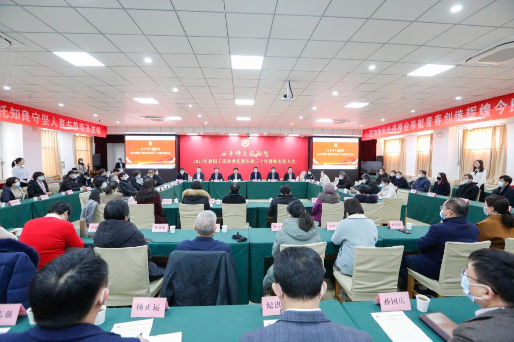 曲阜师大新闻中心讯(通讯员:孟祥水 摄影:刘萌 孙红梅) 12月30日下午,曲阜师大隆重举行2021年教职工荣休典礼暨从教三十年教师表彰大会,来自两校区的荣休教师代表和从教三十年教师代表欢聚一堂,以一场特别的仪式,营造感恩致敬风尚,弘扬尊师重教传统。学校党委书记戚万学,校长张洪海,党委常委、副校长屈跃宽,党委常委、组织部部长郭庆兵,党委常委、宣传部部长张隆海出席典礼;荣休教职工代表、从教三十年教师代表、相关职能部门负责人、在职教师代表和学生代表参加了典礼。典礼由屈跃宽主持。