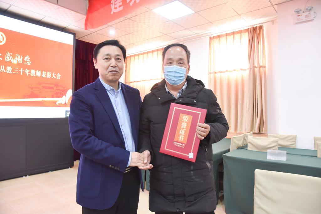 校长张洪海为从教三十年教师颁发荣誉证书