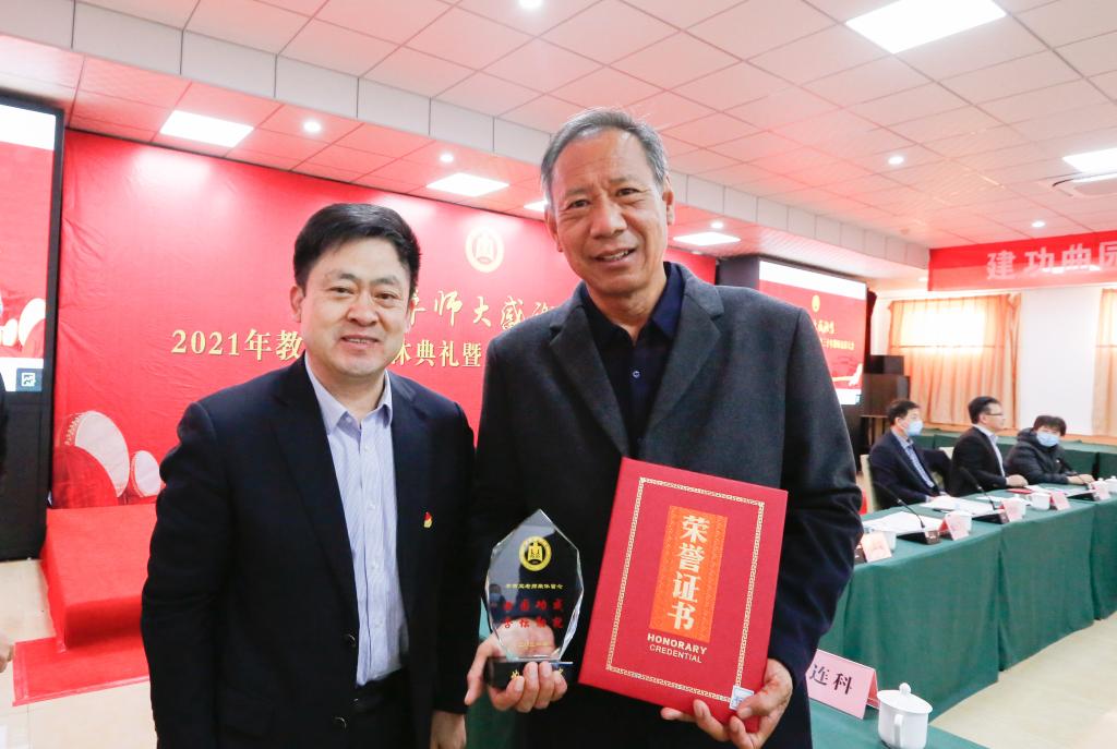 党委书记戚万学为荣休教职工颁发荣休证书及纪念牌