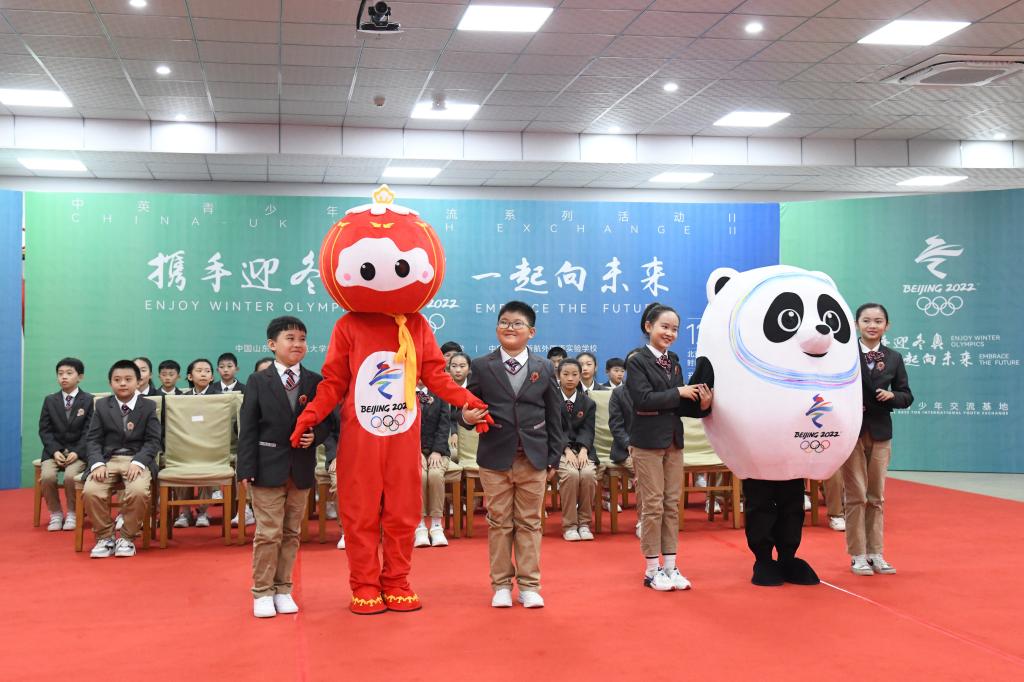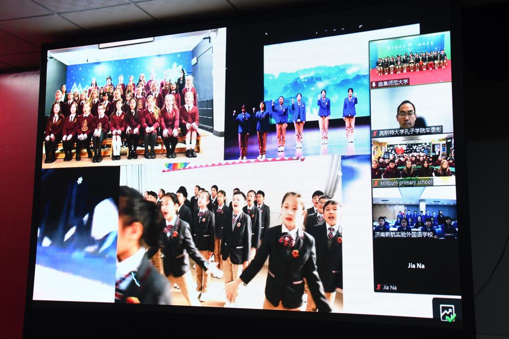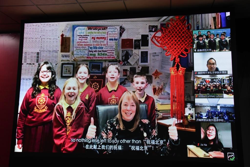 “我最喜欢的冬奥会运动员是武大靖”“我喜欢的运动是冰球”……英国米尔本小学的小朋友分享了对于北京冬奥会的期待。来自济南新航外国语学校同学们展示了热情欢快的大鼓和舞蹈,表达对于冬奥会的祝福。