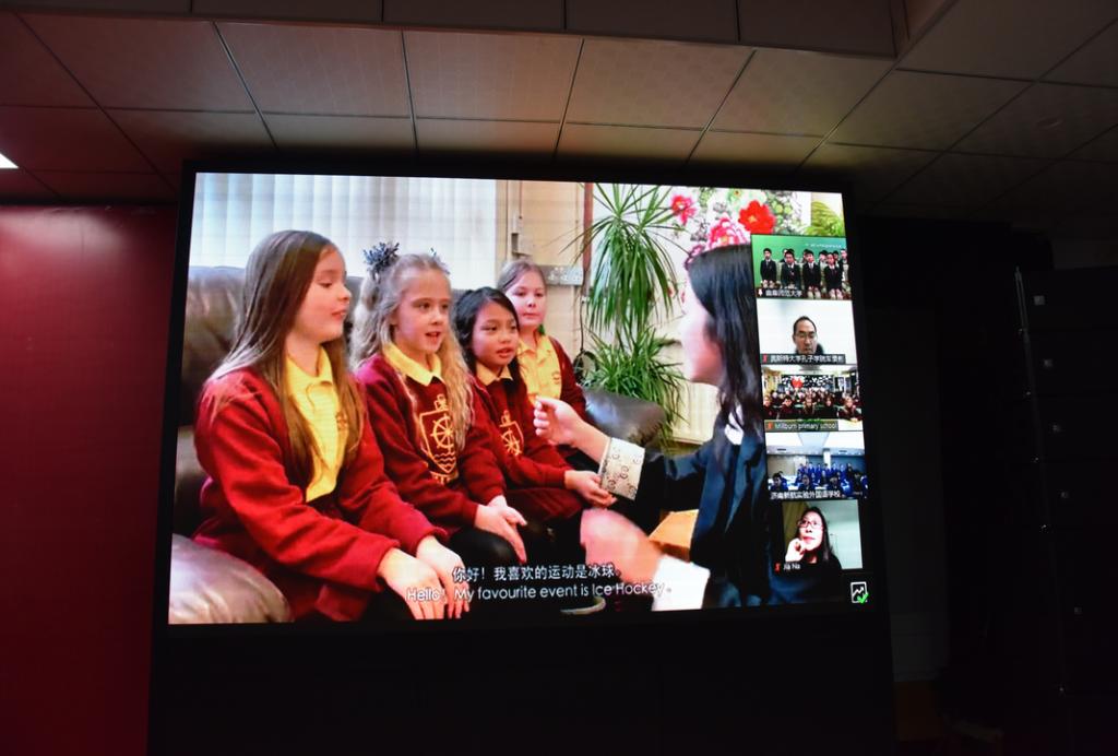 交流开始,首先播放了英国米尔本小学专门录制的祝福视频,《让世界充满爱》的中文合唱饱含着真挚的祝福,让大家倍感温暖。XK在线附小、济南新航外国语学校的校长和班主任带领各自班级同学作了热情的自我介绍,英国米尔本小学校长及同学们送上了热情的祝愿。