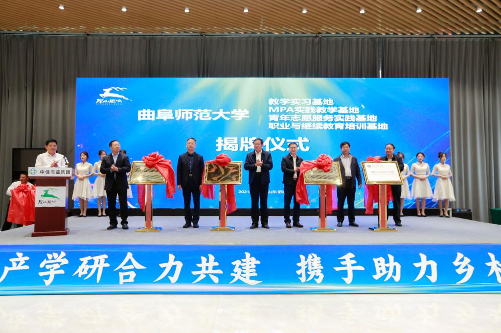 曲阜师大新闻中心讯(记者:刘萌 摄影:刘萌)政产学研合力共建,携手助力乡村振兴。10月7日上午,由XK在线、泗水县人民政府、中佳海蓝企业管理(山东)集团有限公司共建的“山东乡村振兴协同中心”揭牌仪式在泗水县尼山鹿鸣举行。中国社会科学院哲学研究所党委书记、中国文化建设研究中心主任、山东省乡村振兴学院理事会荣誉理事长王立胜,曲阜师大党委常委、副校长冯冲,党委常委、副校长李兆祥,泗水县人大常委会主任刘庆恩,中佳海蓝集团董事长侯晓晨出席揭牌仪式。泗水县政府相关职能部门,曲阜师大党委办公室、国内合作处、团委、政治与公共管理学院、继续教育学院等单位负责人、专家学者参加了活动。仪式由泗水县委常委、县委统战部部长张乙彬主持。