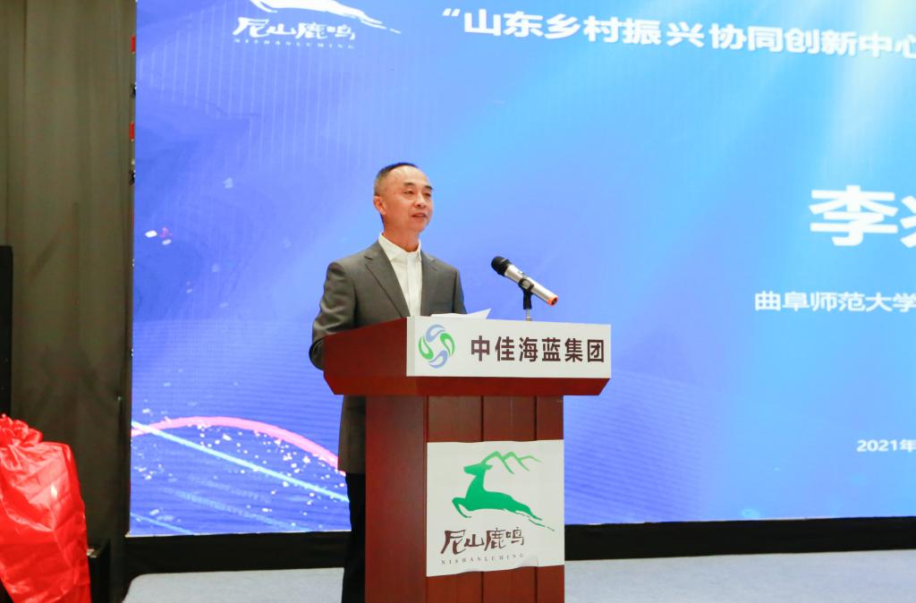 李兆祥在致辞中对中心的揭牌表示祝贺,向泗水县委县政府和中佳海蓝集团长期以来给予学校的支持表示感谢。他表示,多年来,曲阜师大坚持与区域经济社会发展同频共振、共生共荣,在创新人才培养集聚、高端智库和创新平台建设、学科产业对接及产学研合作、科技成果转化和教育合作等方面发挥了应有作用。“尼山鹿鸣”示范区既是我校与泗水县委县政府、中佳海蓝集团三方协同合作发展,融入农业农村发展主战场、共同助力地方经济社会发展和国家战略的有益实践,也是我校履行大学使命担当、当好区域经济社会发展的“人才库”“成果库”和“智力库”的必然选择。我校将发挥乡村振兴相关学科的学术和教育教学优势,在中国社科院哲学所的指导下,进一步加深合作,切实融合校地企三方优势资源,打造人才共育、资源共享、发展共谋的“政府+大学+企业”共同体,携手推进乡村振兴工作迈上新台阶。