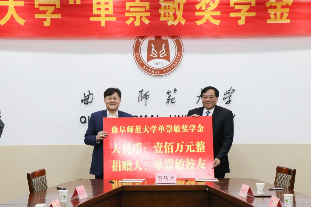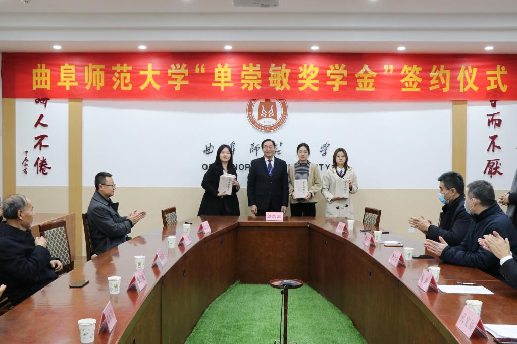 曲阜师大新闻中心讯(记者:刘萌)12月27日,我校举行“单崇敏”奖学金签约仪式,奖学金捐资人、我校中文系1961级校友,山东宝威教育集团董事长单崇敏,山东宝威教育集团总裁单志勇,我校副校长、孔子教育基金会理事长冯冲出席签约仪式,离退休教师骆承烈教授、邓承奇教授,威海校友会、国内合作处、文学院、数学科学学院、外国语学院等单位负责人参加了会议。会议由国内合作处处长孔宪福主持。