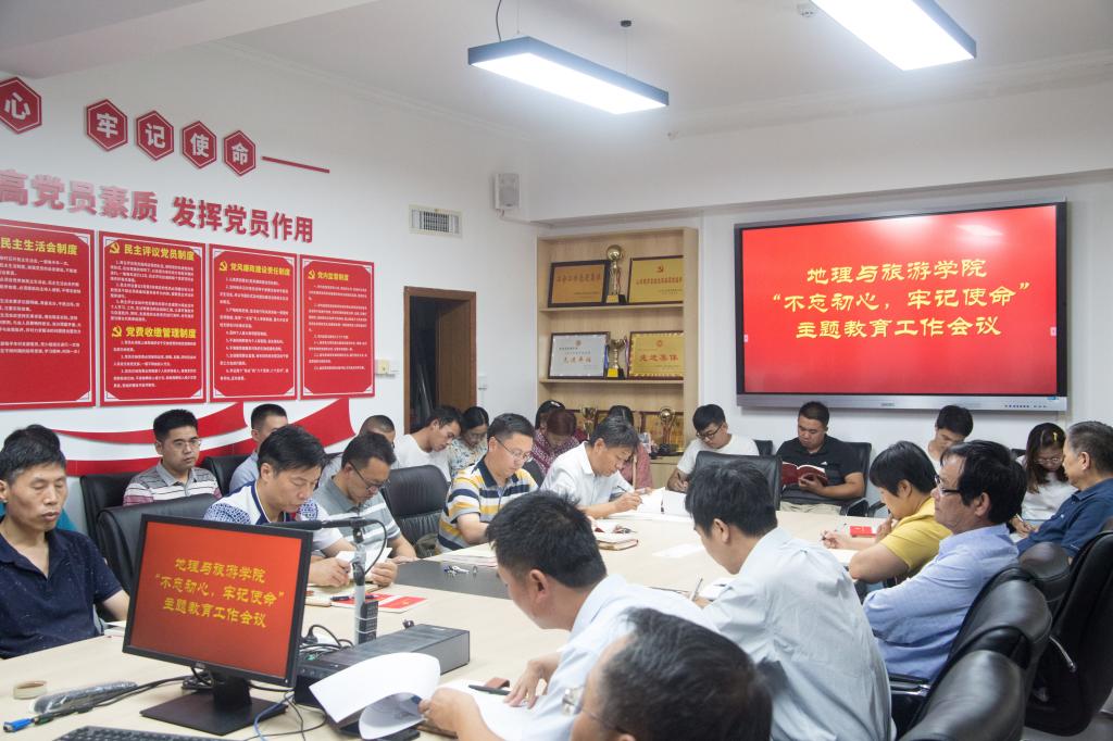 地理与旅游学院党委召开扩大会议对开展“不忘初心、牢记使命”主题教育进行了专题研究部署,成立了领导小组,制定了实施方案,要求全体党员同志以高度的政治自觉、严肃的政治态度、饱满的政治热情,投入到主题教育中。