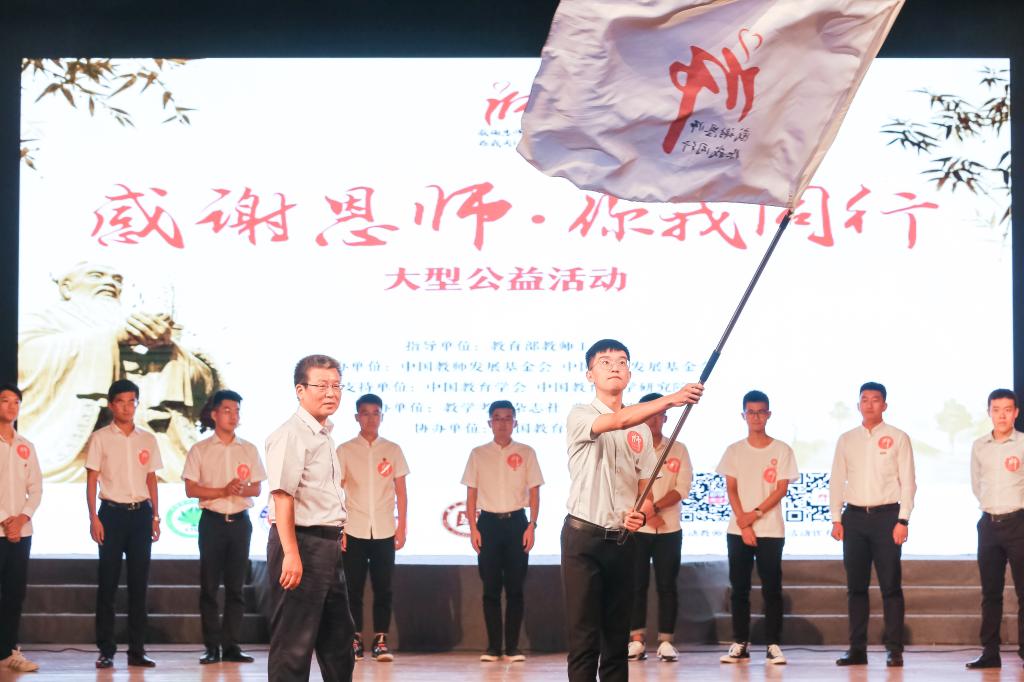 王建光向参加启动仪式的大学代表授旗,象征“感念恩师,感悟传承”的旗帜将在全国高校中薪火相传。