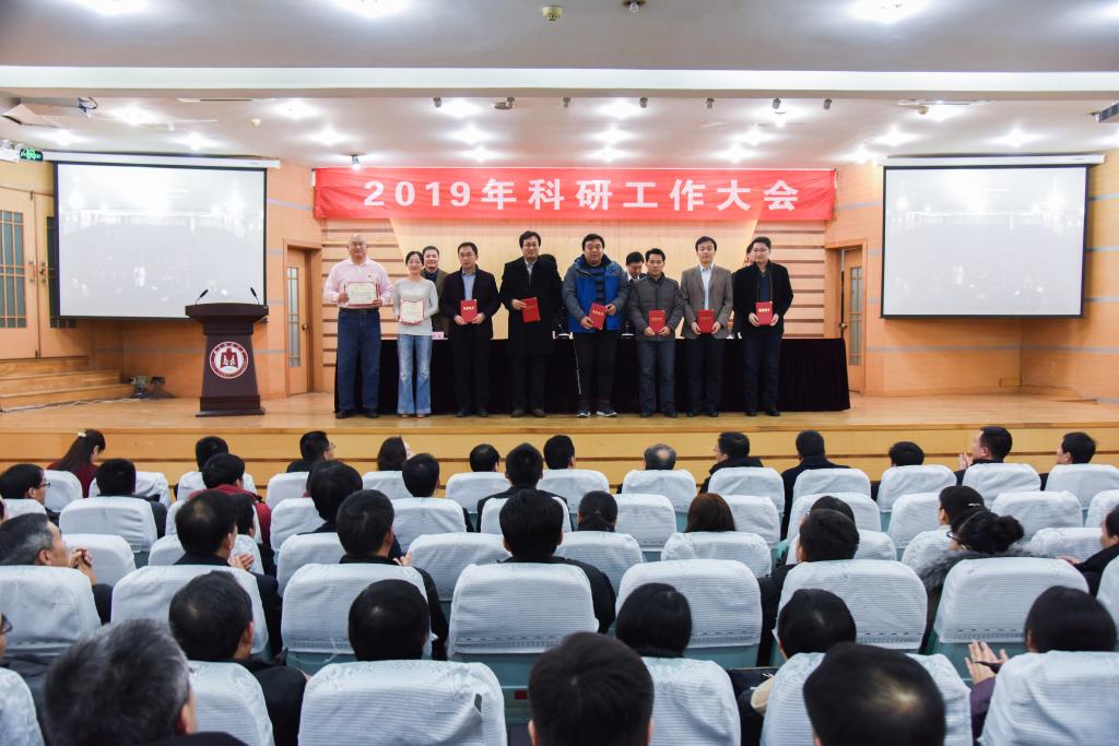 党委书记戚万学主持会议并发表讲话,校长张洪海发表讲话,副校长夏云杰作科研工作报告,副校长冯冲宣读了表彰2018年度科研工作先进单位、优秀科研工作者及科研管理先进个人的决定。