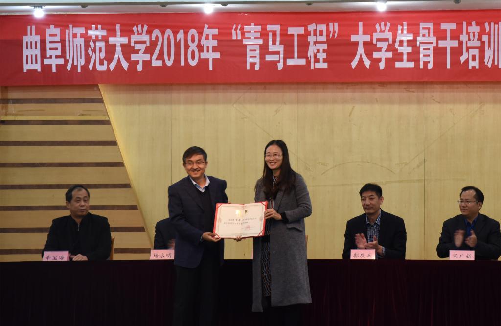 2018年我校团委通过聘请专家学者担任导师、新增课程等措施,重点完善“青马工程”课程体系,仪式上,王继锁为导师代表、马克思主义学院教师肖芳颁发了聘书。