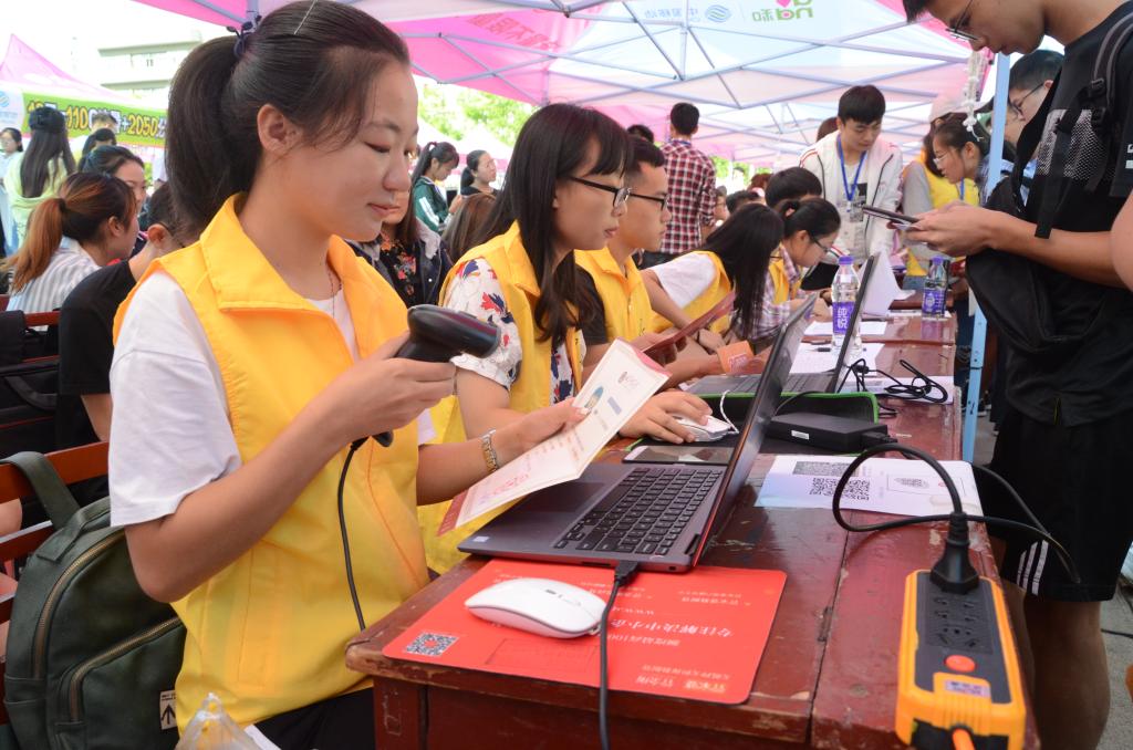 “报到要趁早,萌新扫一扫。”今年,我校广泛应用“扫码报到”这一更受“00后”欢迎的方式迎接新生。录取通知书上为每名新生制作了专属二维码,入学后,凭借二维码只须让学院工作人员扫一扫,即可轻松办理入学注册报到和住宿手续。传统的“排长队”的现象已不复存在,取而代之的是各报到点的井然有序、新生的便捷和工作人员的从容。扫码后,后台可实时统计出已报到和未报到的比例及人数。