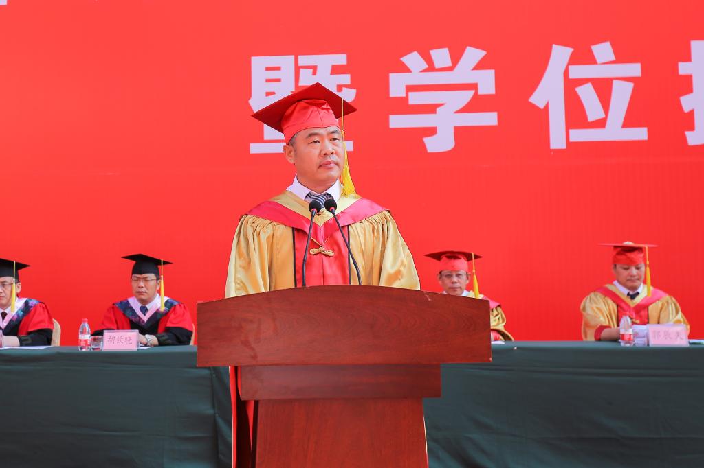 张洪海代表学校,向顺利完成学业的同学们表示最热烈的祝贺,向精心培育他们的老师、付出辛勤养育的父母、给予支持鼓励的亲友,致以最诚挚的感谢和最崇高的敬意。