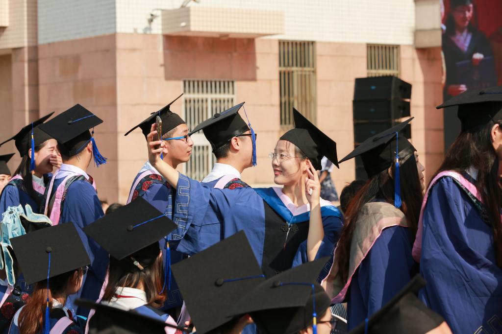 在充满深情的乐曲声中,毕业生们意气风发走上红毯,迈过“就道”“弘道”之门,学校领导、学位评定委员会委员和教授代表,首次为全体在校毕业生逐一拨穗正冠、颁授证书,祝贺他们学业有成,一张张照片定格下青春中最美的瞬间。