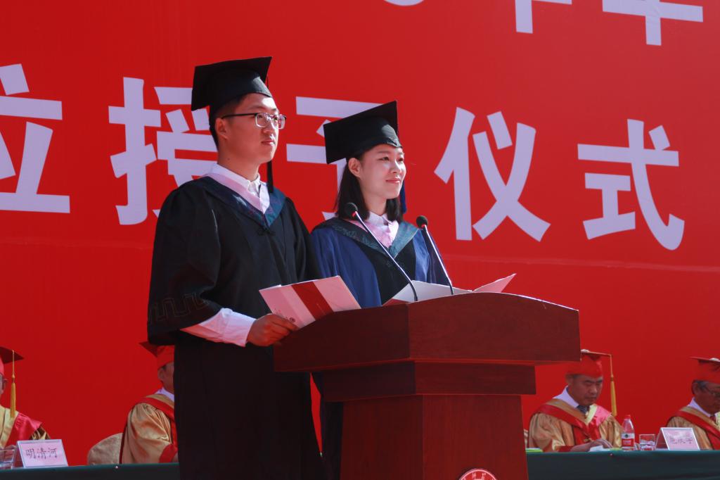在毕业生代表发言环节,本科毕业生代表法学院刘涛同学、化学与化工学院郑培群同学,硕士毕业生代表传媒学院赵彤同学,博士毕业生代表数学科学学院孙奉龙同学,一起回顾了曲园逐梦之路、畅谈了大学毕业感怀。有幽默的调侃,更有深情的诉说,与大家分享了毕业学子对母校曲园的热爱、对父母恩师的感激、对好友同窗的不舍、对再启新程的信心,以及对“曲园精神”的深刻感悟。他们表示,将把立己达人的德性、崇真尚实的睿性、弘毅致远的韧性这一“曲园精神”发扬光大,并衷心祝愿母校明天更加灿烂辉煌。