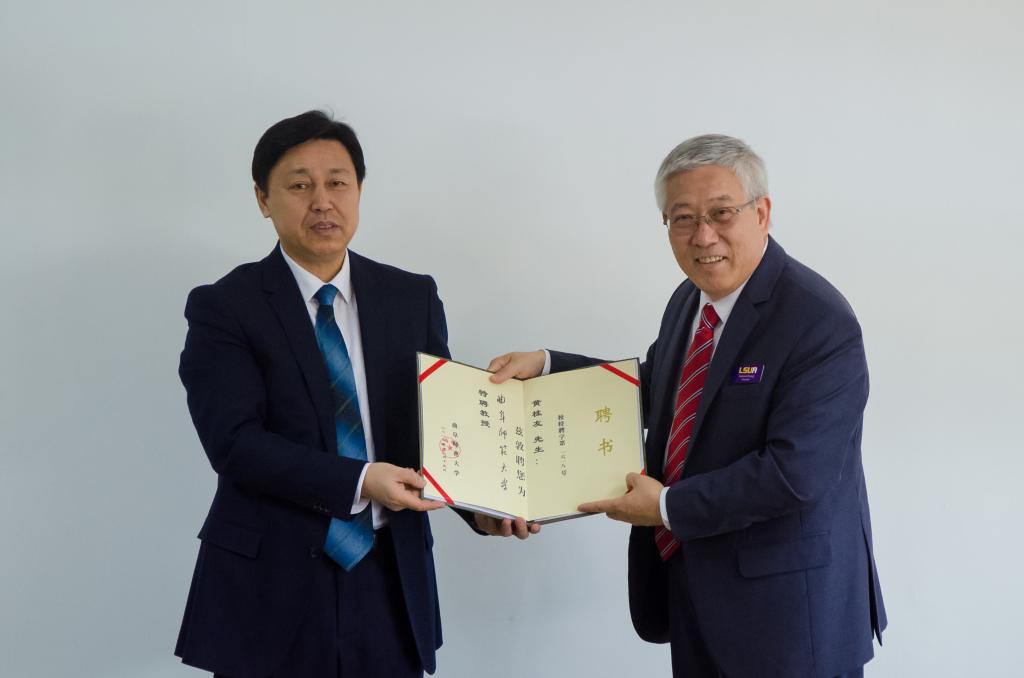 4月26日,我校杰出校友、美国路易斯安纳州州立大学亚历山大分校校长黄桂友教授回母校访问交流。校长张洪海会见了黄桂友,并为他颁发了特聘教授聘书。国际交流合作处、人事处、校友工作办公室和外国语学院负责人参加了会见。