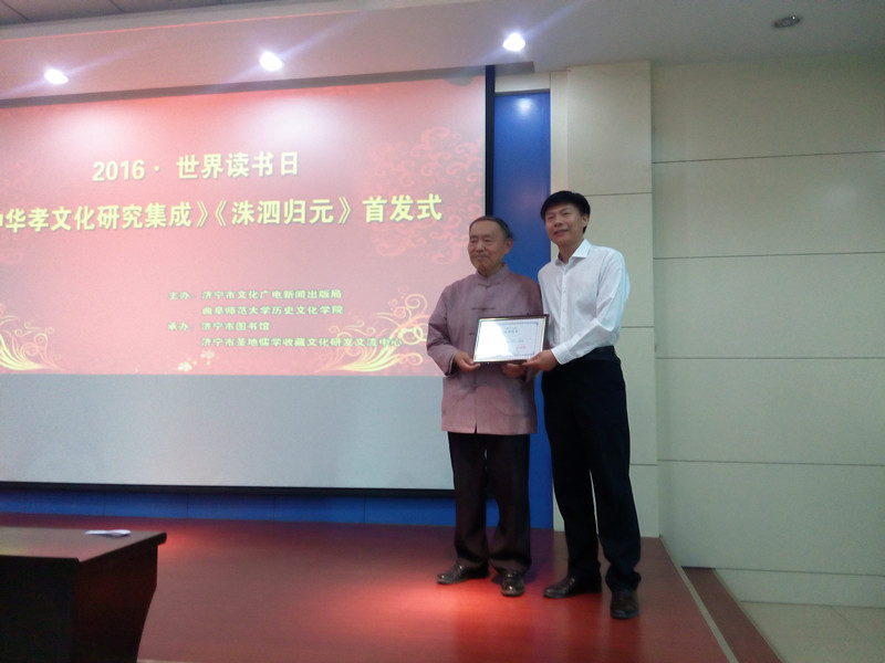 4月22日,由济宁市文化广电新闻出版局、XK在线历史文化学院主办,在济宁市图书馆举行了骆承烈教授新书《中华孝文化研究集成》、《洙泗归元》两部儒学巨著的首发仪式。其中,《中华孝文化研究集成》共12册,约600余万字,是以“孝”为主体的古今最大的一部孝文献巨著。