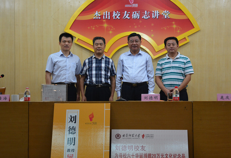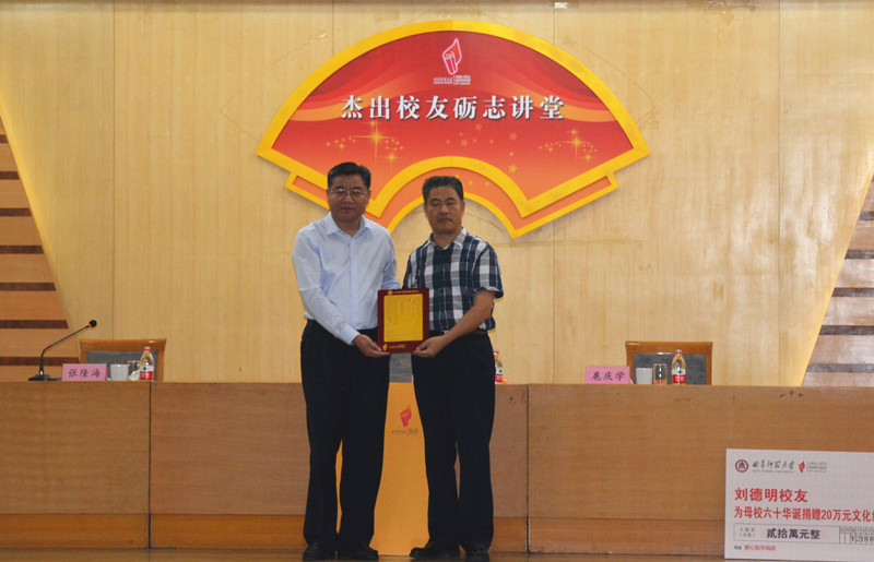 副校长扈庆学代表学校为刘德明校友颁赠了“杰出校友母校演讲”纪念牌及纪念章,并赠予其在校期间的学籍卡和成绩单复印件。刘德明校友留下了自己的手模,并专门录制了对母校的祝福微视频。刘德明校友心系母校,感恩母校,继捐资设立“明德奖学金”后,在母校六十华诞之际,这次捐赠了价值20万元的文化纪念品。