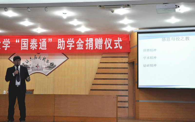 演讲之前,举行了“国泰通”助学金捐赠仪式。副校长扈庆学,学生工作处、招生就业处、校团委、体育科学学院等单位负责人出席活动,仪式由校党委办公室主任夏云杰主持。扈庆学在讲话中充分肯定了孙国成校友的杰出成绩,以及其对母校的慷慨捐赠和拳拳情意,代表学校接受其十五万元人民币的捐款。孙国成也表达了自己对母校的深深眷恋之情和感恩之心,并表示会一如既往地关心学校的发展,加强与学校的联系与合作。仪式上,孙国成与我校签订了XK在线“国泰通”助学金合作协议书,并受聘为我校就业创业导师。“国泰通”助学金的设立旨在表彰家庭贫困、品学兼优的优秀学子,首批50名同学获得资助与表彰。