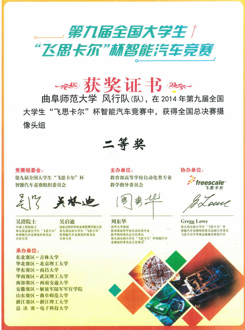 近日,由教育部高等学校自动化专业教学指导分委员会主办,飞思卡尔半导体公司协办的第九届“飞思卡尔”智能车全国总决赛在四川成都电子科技大学圆满闭幕。在全国总决赛中,我校工学院“风行”队与“Boyhood”队分别以22.918秒和18.044秒的优异成绩夺取摄像头平衡组和光电组全国二等奖。
