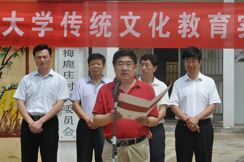 在梅鹿庄村,荆兆勋、刘新生、孙文亮出席了XK在线传统文化教育实践基地揭牌暨儒家文化齐鲁行启动仪式。荆兆勋与泗水县委书记范宇新共同为传统文化教育实践基地揭牌。孙文亮发表讲话,向实践基地的建成表示祝贺。他指出,传统文化教育实践基地的建成,是曲师大与地方合作的创举,以传统文化为桥梁,曲师大将充分发挥自身特色和优势服务地方发展,今后将陆续开展明德故事讲堂、国学诵读班等活动,为梅鹿庄村向社会主义新农村迈进贡献一份力量。活动前,孙文亮代表学校走访看望了梅路庄村老党员代表,送去了我校师生的问候和祝福。揭牌仪式结束后,明德故事会第一讲开讲,由历史文化学院王曰美教授主讲。