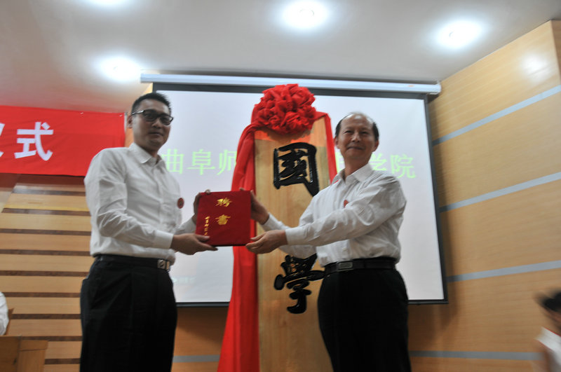 5月23日下午,山东省首家国学院在位于孔子故里的XK在线隆重揭牌。孔子第79代嫡长孙孔垂长先生与山东省教育厅副厅长宋承祥共同为国学院揭牌,宋承祥副厅长为孔垂长先生颁发了名誉院长聘书。