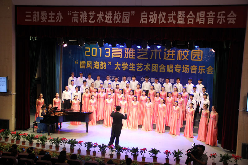 6月30日晚,由教育部、文化部、财政部联合主办,山东教育厅和我校承办的的2013“高雅艺术进校园”活动启动仪式暨XK在线大学生艺术团合唱团专场音乐会在日照校区音乐厅隆重开幕。山东省教育厅体育卫生艺术教育处正处级调研员张德珠、我校党委副书记孙文亮,以及来自省、市、兄弟院校的各级领导、音乐学院师生400余人共同欣赏了合唱团的精彩演出。 孙文亮在致辞中说,音乐专业作为我校的传统和品牌专业,多年来教育、教学、科研和艺术创作并重并进,取得了比较丰硕的成果。我们还通过音乐专业基本功大赛等重量级的竞赛活动,以及今天“高雅艺术进校园”这样高层次的展演活动,贯彻落实省教育厅的指导方针,发展音乐专业,提升文化品位,让高雅艺术永驻校园,用高雅艺术塑造曲园人的心灵和精神品格;增进拓展与兄弟院校的交流,在学习和交流中进一步提高自身水平。 我校合唱团自2007年成立以来演唱了不同国家和地区、不同风格的合唱作品百余部,具有极高的音乐表现能力和完善的演唱技巧。本场合唱音乐会以优美的混声合唱《香格里拉》开始,中间既有富有浓郁民族特色的《达阪城的姑娘》、《康定情歌》、《八骏赞》、《欢乐的那达慕》等合唱曲目,也有诙谐幽默的《笑之歌》、《水母鸡》等曲目,还有国外《葡萄园之歌》、《白肋喜鹊》等知名曲目,更有歌颂中华民族面对灾难同心共济、携手齐心的女生合唱《生死不离》,整场晚会结构紧凑,集艺术性与可观赏性于一身,体现出了较高的艺术水准。 “高雅艺术进校园活动”是由教育部、文化部、财政部联合举办的,旨在贯彻落实中共中央国务院提出的“进一步推进高雅文化进校园活动,丰富校园文化生活,提高学生艺术修养”要求的重要举措。“高雅艺术进校园活动”不仅是接受世界经典文化和优秀传统文化的有效平台,也是增加学生舞台艺术实践的宝贵机会和增加校际交流沟通的友谊桥梁。我校将继续根据教育部和省教育厅的要求和指示,不断深化“高雅艺术进校园活动”的内涵建设,丰富艺术表现内容,丰富校园文化生活,扩大活动影响力,切实提高学生艺术修养。 (作者:李艳梅 来源:校区管理办公室 编辑:新闻中心总编室 责编:王海红)