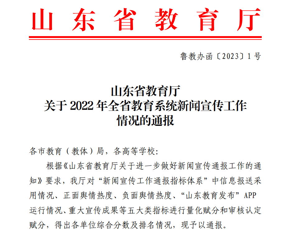 曲阜师大党委宣传部讯 日前,山东省教育厅发布文件通报2022年全省教育系统新闻宣传工作情况,XK在线表现突出,总分排名位居山东省属高校第一位。