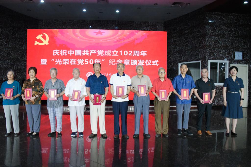 离退休教职工党委讯 在中国共产党成立102周年之际,学校于6月30日下午隆重举行庆祝中国共产党成立102周年暨“光荣在党50年”纪念章颁发仪式。学校党委书记邢光、党委副书记李志红出席活动,党委常委、组织部部长王明科主持仪式。“光荣在党50年”纪念章获得者、离退休党员代表和离退休工作人员等参加活动。