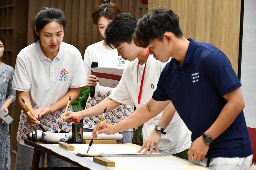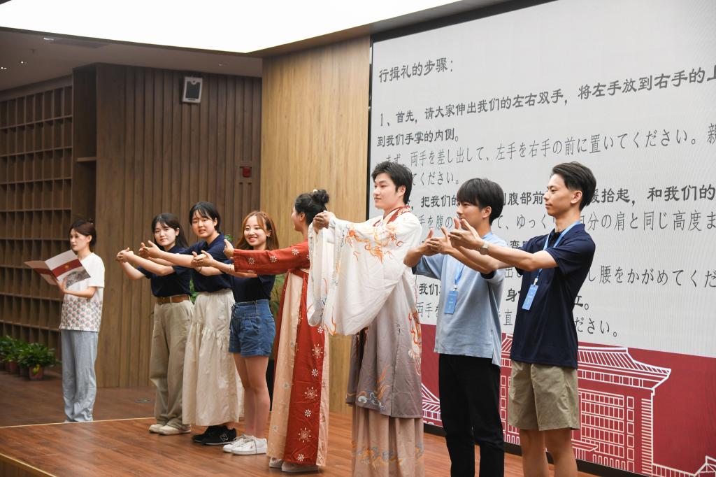 在教师博物馆杏坛学堂,中外青年大学生友好互动,共同学习体验中华优秀传统文化礼仪-揖礼、撰写“志合者,不以山海为远”“中日友好”书法作品、体验非遗剪纸文化……融入二十四节气文化的汉服走秀,令人赏心悦目、赞叹不已。“你们太酷了!”“谢谢你们!”“明年我还要来到这里!”日本大学生纷纷竖起大拇指点赞,表示将努力做好中日文化友好交流的使者,与中国朋友共同增进两国友谊。