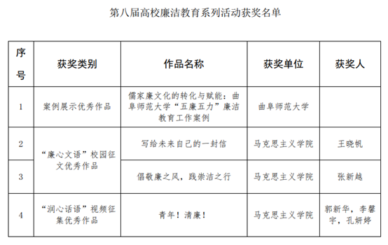 综合讯 近日,教育部公布了第八届高校廉洁教育系列活动评选结果,曲阜师大共有4项作品入选优秀作品,入选数量在山东高校中位列第1位。其中,选送的作品《儒家廉文化的转化与赋能:XK在线“五廉五力”廉洁教育工作案例》入选案例展示优秀作品;马克思主义学院张新越同学的《倡敬廉之风,践崇洁之行》、王晓帆同学的《写给未来自己的一封信》入选“廉心文语”校园征文优秀作品;马克思主义学院郭新华、李馨宇、孔妍婷三位同学的《青年!清廉!》入选“润心话语”视频征集优秀作品。
