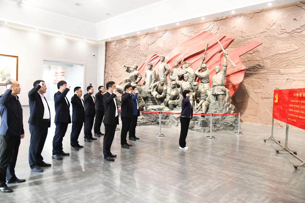 在纪念馆,全体党员在鲜红的党旗下庄严宣誓,重温入党誓词,坚定理想信念。学校党委书记邢光与郯城县委书记王立军共同为XK在线“大思政课”实践教学基地揭牌。