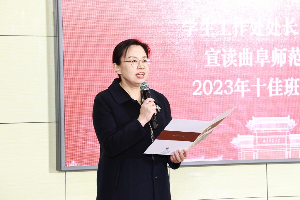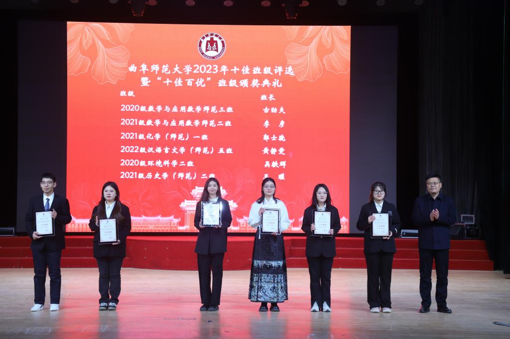 在“十佳百优”班级评选活动中,经过学院选拔推荐、材料审查、学校初评打分等环节,评选出100个百优班级,并按得分排序确定了十佳候选班级。在十佳班级评选中,通过初评成绩和现场评分加权计算进行排名,学生工作处处长姜美颖公布了十佳班级名单。经过激烈角逐,曲阜校区数学科学学院2020级数学与应用数学师范3班、数学科学学院2021级数学与应用数学师范2班、化学与化工学院2021级化学(师范)1班、文学院 2022级汉语言文学(师范)5班、生命科学学院2020级环境科学2班、历史文化学院2021级历史学(师范)2班,日照校区工学院2021级电气1班、翻译学院2021级商务英语1班、法学院2021级法学3班、工学院2022级自动化1班获得十佳班级称号。