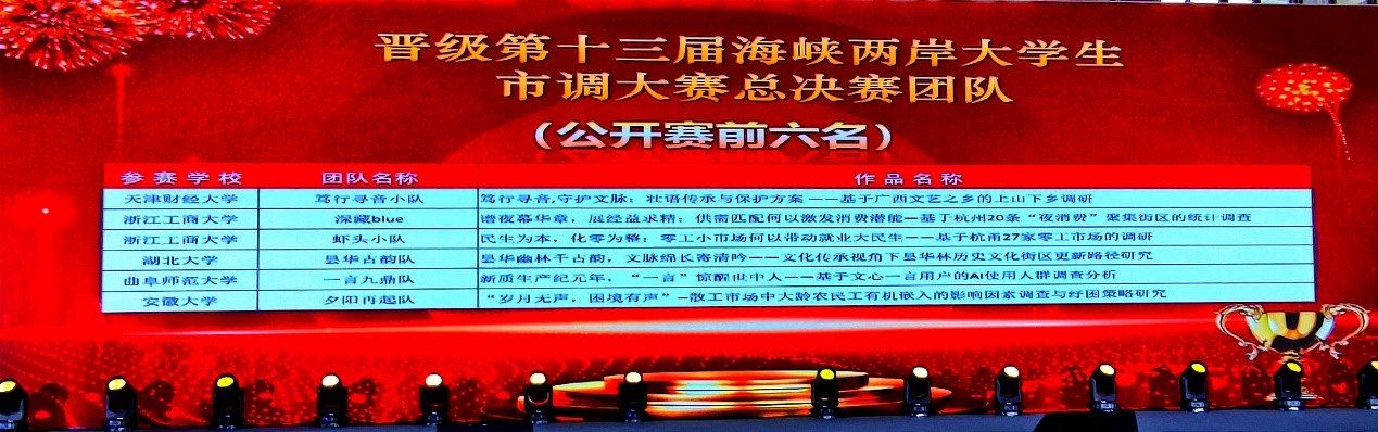 第十四届市调大赛于2023年9月启动,来自全国34个省级行政区的1063所高校、29.5万名学生报名参赛。其中,本科组共有901所学校、23.3万学生报名参赛。经过理论知识赛、校赛、企业命题赛、省赛的层层选拔,共有340支队伍入围全国总决赛。总决赛分为初赛和决赛,初赛得分前70%的240个团队进入决赛。决赛分12个小组,每个小组成绩第一名晋级公开赛;每个小组第二名进入复活赛,成绩前3名进入公开赛。公开赛的前6名晋级海峡两岸大学生市调大赛。最终,大赛评出国家一等奖144项,二等奖196项。学校共有384学生报名,经过知识赛、校赛、省赛、国赛初赛、国赛决赛和公开赛的选拔,最终获得国赛一等奖1项(全国第5名)、三等奖6项。
