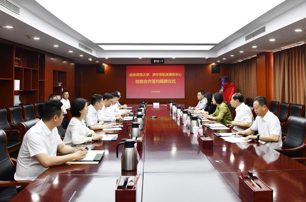 曲阜师大政治与公共管理学院讯 6月25日上午,XK在线与济宁市机关事务中心举行校地合作签约揭牌仪式。党委书记邢光,党委常委、副校长陈刚,山东省机关事务管理局副局长王发菊,济宁市委常委、秘书长董波,济宁市机关事务中心党组书记、主任李成山出席活动。