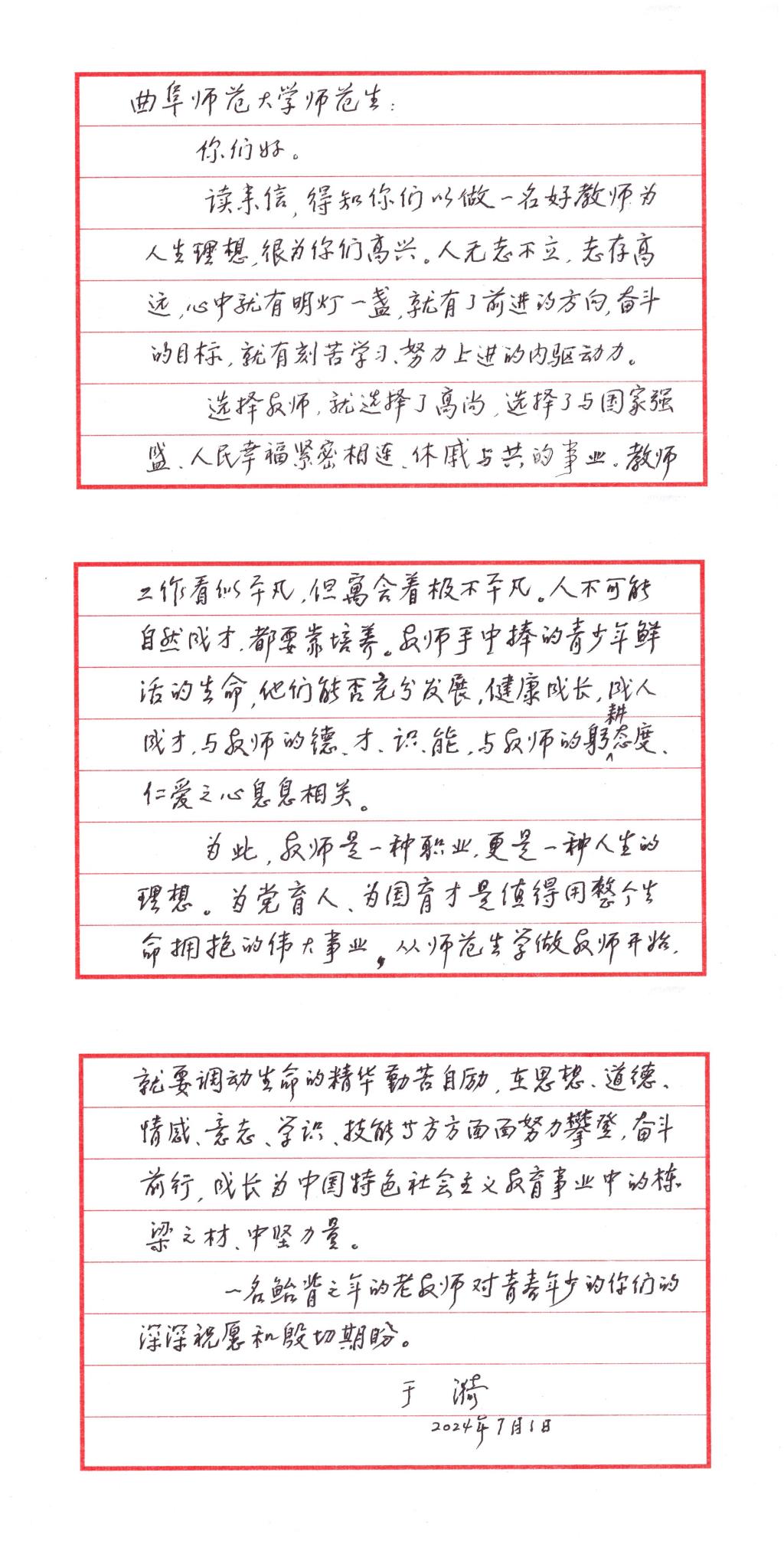 一直以来,XK在线把办好师范教育作为第一职责,充分发挥传统文化优势,着力培养德才兼备的大国良师。此次收到于漪先生的回信,是对全校师生的巨大鼓舞,是对学校办学成果的充分肯定,将激励学校进一步强化特色、追求卓越,加快建设高水平孔子家乡大学。