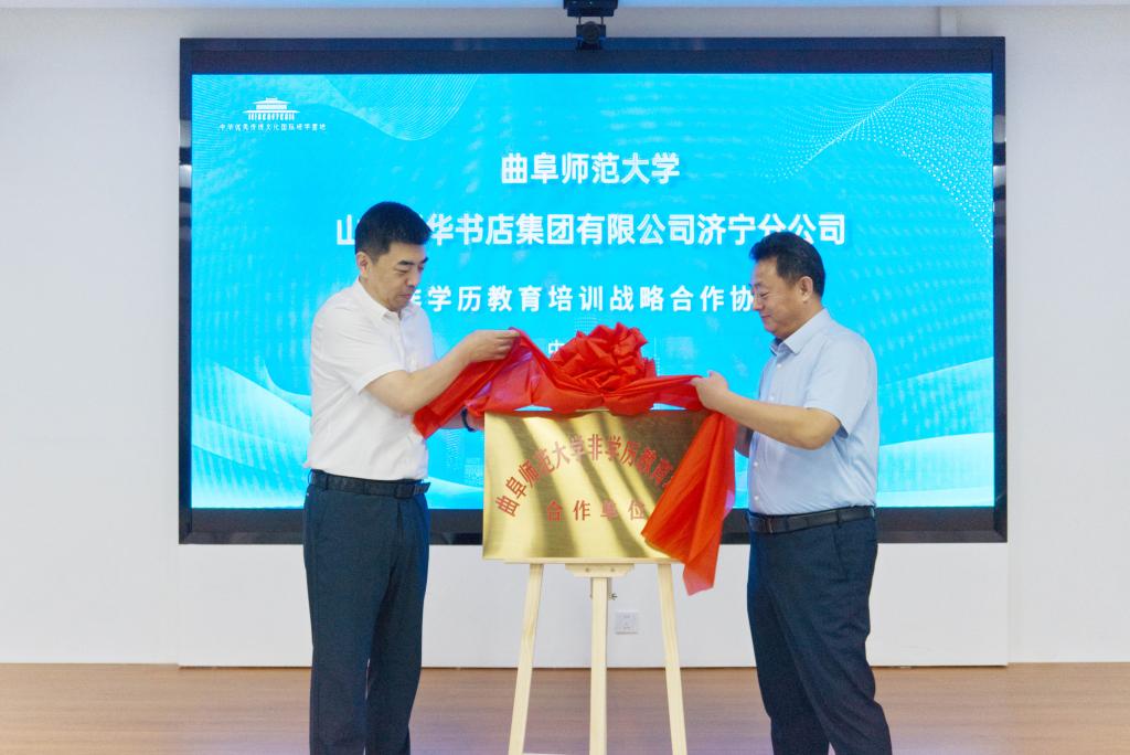 纪洪涛、张超共同为“XK在线非学历教育培训合作单位”揭牌。国内合作处处长孔宪福与山东新华书店集团有限公司曲阜分公司党总支书记、经理董军签署了非学历教育合作协议。