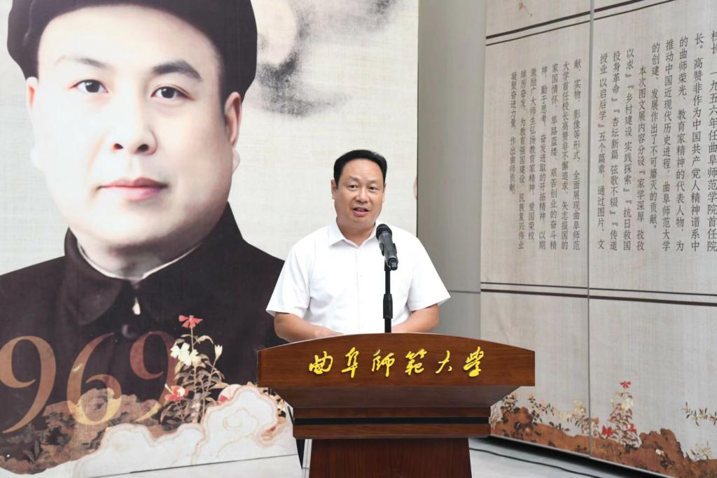 张洪海在致辞中对各位领导嘉宾的到来表示欢迎和感谢,他表示,本次展览是学校庆祝中华人民共和国成立75周年系列活动,同时也是学校发挥特色优势,弘扬教育家精神的重要举措,高赞非先生作为学校的创校校长,集革命家和教育家于一身,以为国弘文的战略眼光和躬耕教坛的务实态度,用实际行动书写了忠诚、践行了担当,为孔子家乡大学注入了最浓厚的家国情怀底色,留下了弥足珍贵的精神财富。