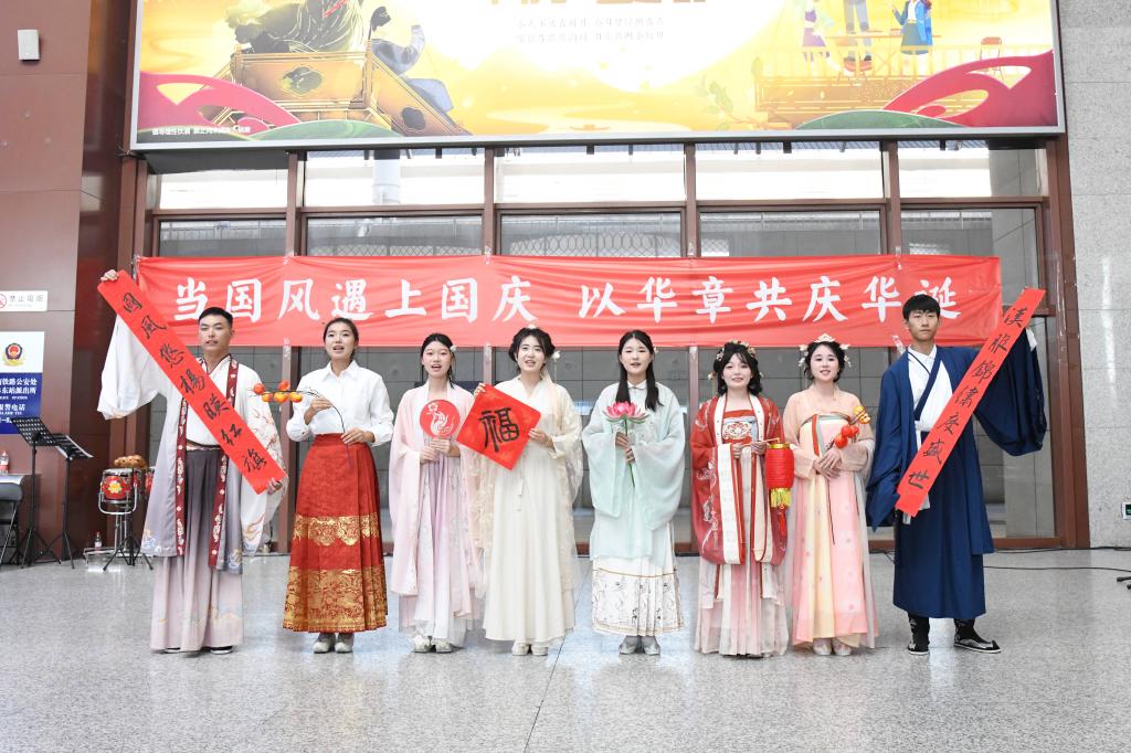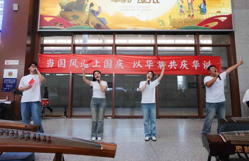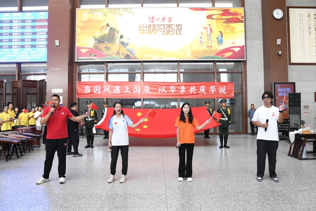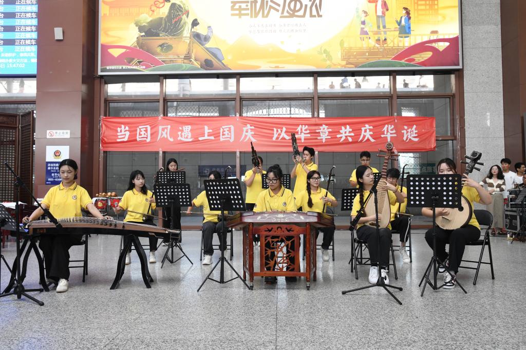 曲阜师大党委宣传部讯 笙、箫、筝、琴等传统乐器奏响国风音乐,候车大厅齐唱《我和我的祖国》,与天安门广场升起过的国旗近距离合影……9月28日下午,XK在线把一堂“当国风遇上国庆”的思政大课带进高铁曲阜东站,秀出国风之美、献礼国庆佳节,在候车大厅上好了涵养爱国之情与文化自信的“公开课”。本次活动由学校党委宣传部策划组织,教师博物馆、学生工作处、团委、音乐学院、美术与书法学院共同举办。
