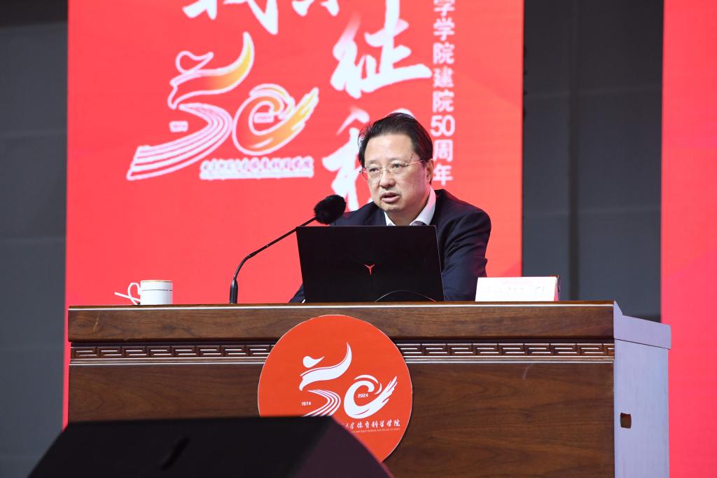 张洪海介绍了XK在线和曲师体育的奋进历程和办学成绩。他表示,50年来,体育科学学院发展成为本硕博、博士后培养层次齐全,建成并保持了山东体育学界十几个“唯一”,以“争第一、争唯一”的姿态,整体建设水平保持省内领先、走在全国前列,为体育强省、体育强国建设作出了卓越贡献;50年来,体育科学学院累计为社会培养输送一万五千余名优秀毕业生,其中涌现出各行各业的优秀人才,他们带着曲园人心怀家国、艰苦奋斗、自强不息、敢为人先的精神特质,在不同的领域书写人生的辉煌,共同为学校增添了荣誉和光彩。