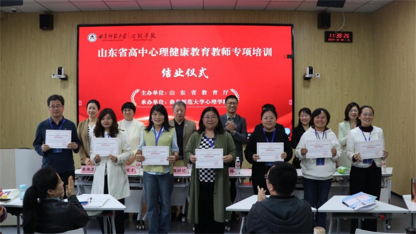 开班仪式由曲阜师大心理学院党委书记罗文伟主持,心理学院院长何文广在仪式上致辞。为了切实帮助参训教师提高心理健康教育学科专业素养和教学能力,曲阜师大心理学院根据山东省教育厅的要求制定了完善的培训方案和考核标准,在理论课程授课环节分别邀请到来自天津师范大学心理学部教授、硕士生导师杨春,山东省戴庄医院儿童青少年心理科主任钱丽菊,中国人民大学附属中学朝阳学校高级教师郑璐与XK在线心理学院教授张怀春进行授课;在现场教学环节,组织学员们前往教师博物馆和孔府、孔林、孔庙进行师德素养和中华优秀传统文化现场体验教学;在课程创新教学设计展示与指导环节,参训教师结合所学内容与自身经验进行优质课程分享。结业仪式上,心理学院负责人为优秀参训教师颁发优秀学员证书。本次培训既有高屋建瓴的专家引领和指导,又有落地实操的一线经验和方法,参训教师共同学习、相互交流,拓宽了工作视野,提升了专业素养,对于提升高中心理健康教育课程的育人效果具有重要意义。