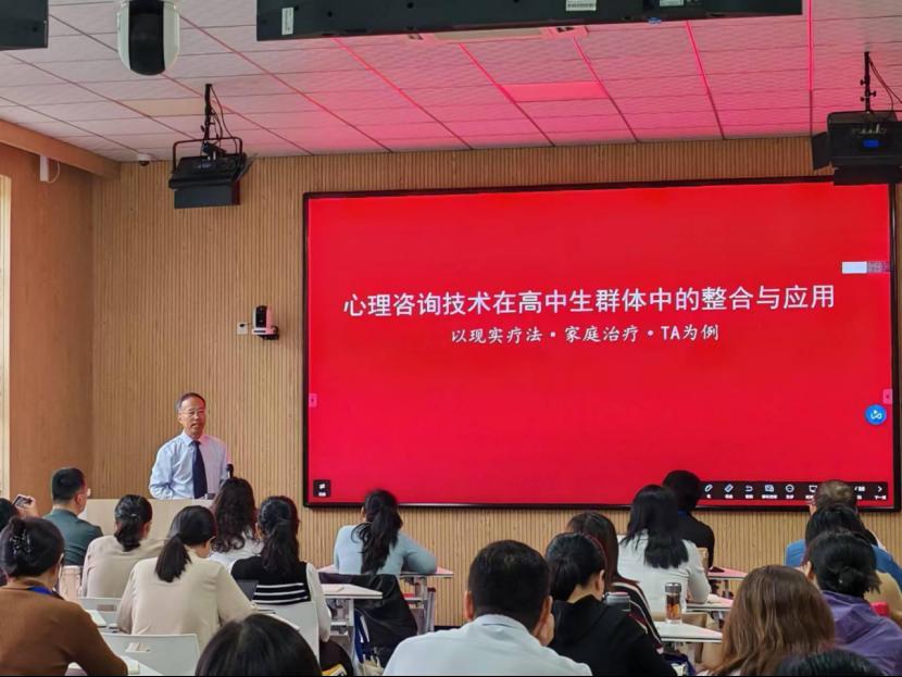 胡凡刚在开班仪式上讲话,介绍了学校的发展历史、办学特色以及在基础教育、教师教育等方面的资源优势。他说,当下社会竞争加剧、教育压力增大、学生的心理健康教育问题越发凸显, 迫切需要一批具有专业素养和实践能力的教师,帮助学生树立正确的人生观、价值观,为学生的心理健康发展保驾护航。本次培训班适逢其时, 希望参训学员能够在本次培训过程中提升心理健康教育的展业素养与实践技能,学有所获、学有所成、学以致用。