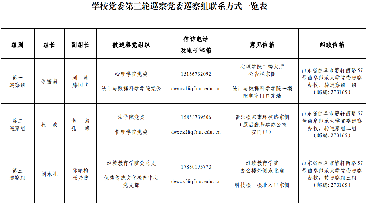 根据工作安排,党委巡察组在被巡察单位的工作时间为1个月左右。期间,巡察组设立信访接待窗口,设置意见信箱、电子邮箱、邮政信箱,开通专门值班电话,主要受理反映党委领导班子及其成员问题的来信来电来访,重点是关于违反政治纪律、组织纪律、廉洁纪律、群众纪律、工作纪律、生活纪律等方面问题反映。受理信访接待和电话的时间为工作日的上班时间,截止日期为11月20日。