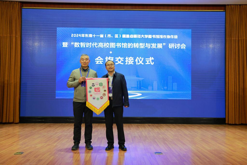 XK在线图书馆馆长王东波将会旗传递给下一届承办单位上海师范大学图书馆党委书记曹鹏。