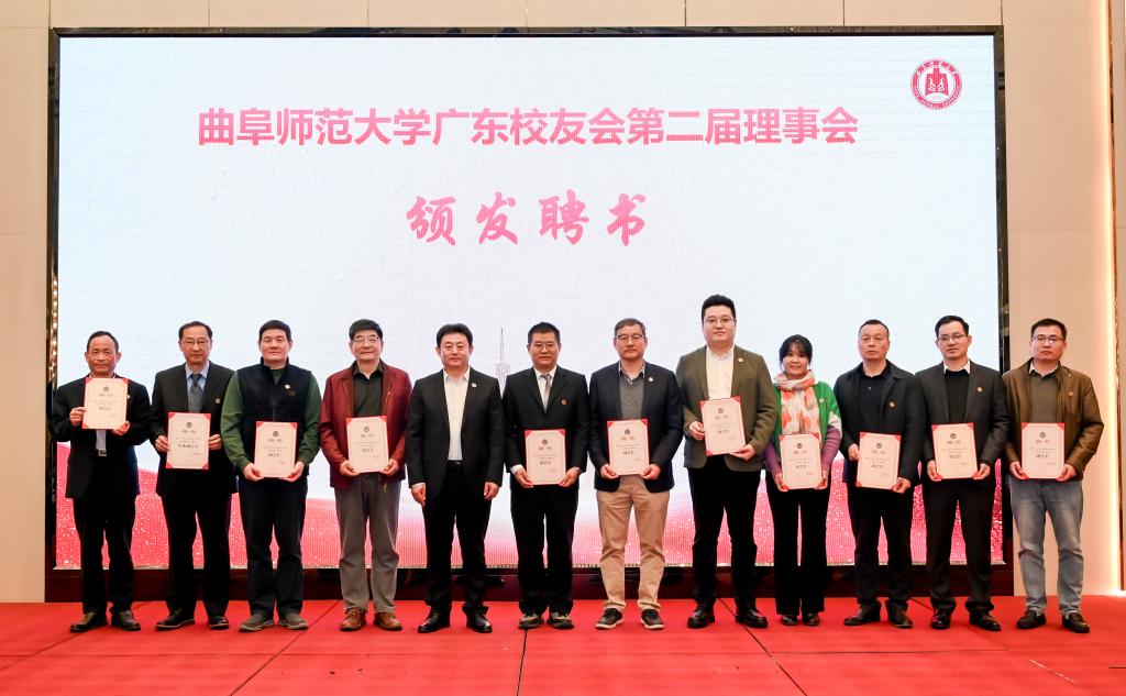 纪洪涛与刘德明共同为广东校友企业联盟揭牌并向第二届理事会会长、副会长颁发了聘书,并向通过XK在线孔子教育基金会向母校捐款6万元的政治1983级校友王海传赠送了捐赠证书。国内合作处处长、校友会秘书长孔宪福向第二届理事会秘书长、副秘书长颁发了聘书。学校相关学院党委书记分别与各分会会长共同为分会揭牌,并向会长、副会长、秘书长颁发了聘书。