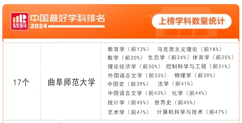 2024年10月,在高等教育评价专业机构软科发布“2024软科中国最好学科排名”中,学校17个学科进入排名榜单,上榜学科总数位居山东省属高校第3位,其中,教育学、生态学、世界史3个学科位居山东高校第1位,外国语言文学、中国史、统计学3个学科位居山东省属高校第1位。同时,学校在2024年取得了外国语言文学一级学科博士学位授权的新突破。学校按照“重点建设一批、接续培育建设一批、扶持储备一批”的原则,逐步形成了优势学科引领、多学科相互支撑、协调发展、重点突出、梯队分明的“雁阵式”学科发展体系。