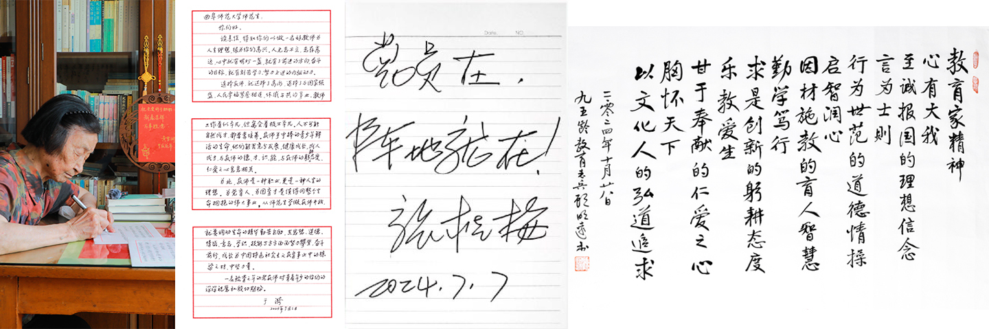 2024年7月,“七一勋章”获得者张桂梅赠言曲园师生“党员在,阵地就在”,勉励XK在线肩负好为党育人、为国育才光荣使命。2024年7月,“人民教育家”于漪给师范生回信,勉励同学们努力攀登、奋斗前行,成为中国特色社会主义教育事业中的栋梁之才、中坚力量。此前,师范生代表致信表达了学习于漪的教育家风范、成长为好教师的决心。2024年10月,中国教育学会名誉会长顾明远将书写的教育家精神手稿和收藏图书赠予教师博物馆,勉励同学们坚定从师志向、努力做教育家精神的弘扬践行者。