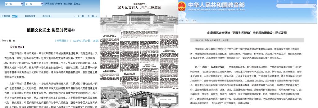 2024年1月,《光明日报》刊发题为《XK在线:在孔子故里讲好教师故事》的报道;7月,教育部官方网站刊发题为《XK在线坚持“四聚力四驱动”推动思政课建设内涵式发展》的典型经验报道;9月,新华社记者来校采访,以《探访孔子故里,一座名叫“教师”的博物馆》为题刊发报道;11月,《光明日报》刊发学校聚焦文化“两创”献智献策的署名文章,中央电视台《新闻直播间》报道学校科研团队推动黄河流域生物多样性研究和湿地生态保护;12月25日,《中国教育报》以《XK在线:聚力弘文育人 培养卓越教师》为题推出整版报道。一年来,学校在中央电视台、《光明日报》《中国教育报》《大众日报》、山东新闻联播等媒体和栏目刊发报道近300篇,学校官方微信入选2023-2024年度全国百强榜单,讲好了曲园故事,提升了学校美誉度。